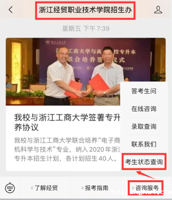 快捷入口:浙江经贸职业技术学院招生微信办公众号点击右下角“咨询服务”中的“考生状态查询”即可。