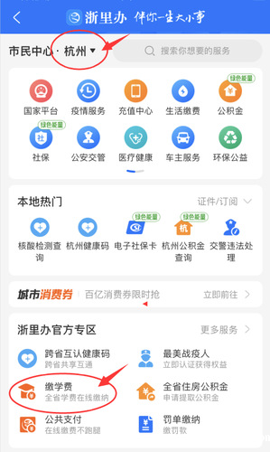 1、手机登录支付宝APP,点 “市民中心”,选择“杭州”,点“缴学费”。