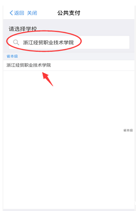 2、在“公共支付”页,选“省本级”,搜索学校“浙江经贸职业技术学院”。