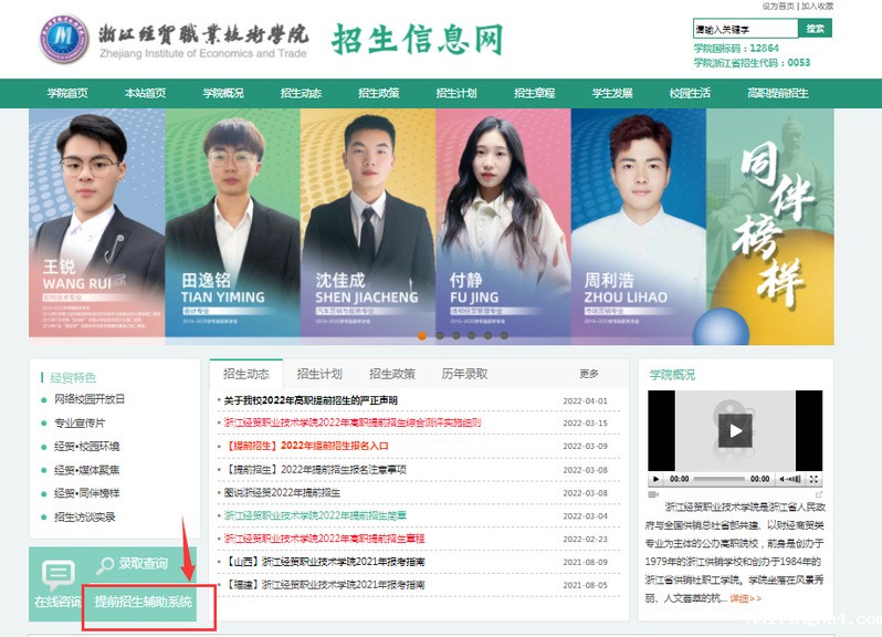 第一步,登录浙江经贸职业技术学院招生信息网(//www.hailinghu4.com),点击“提前招生辅助系统”。