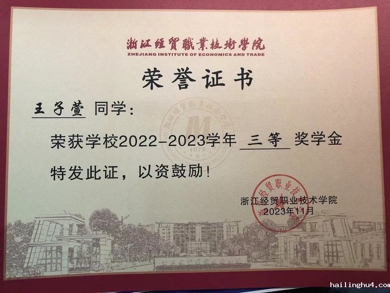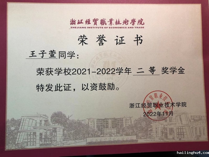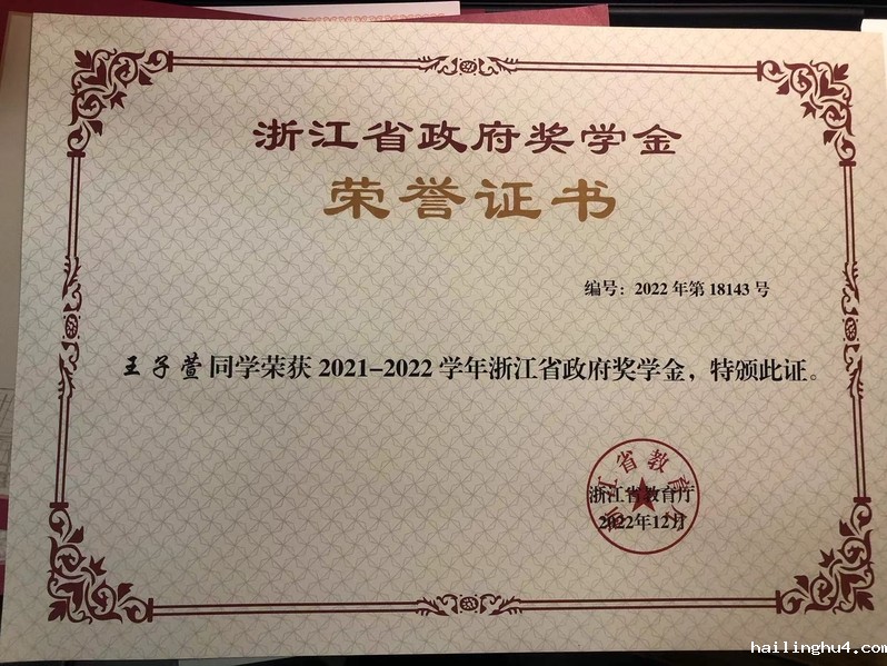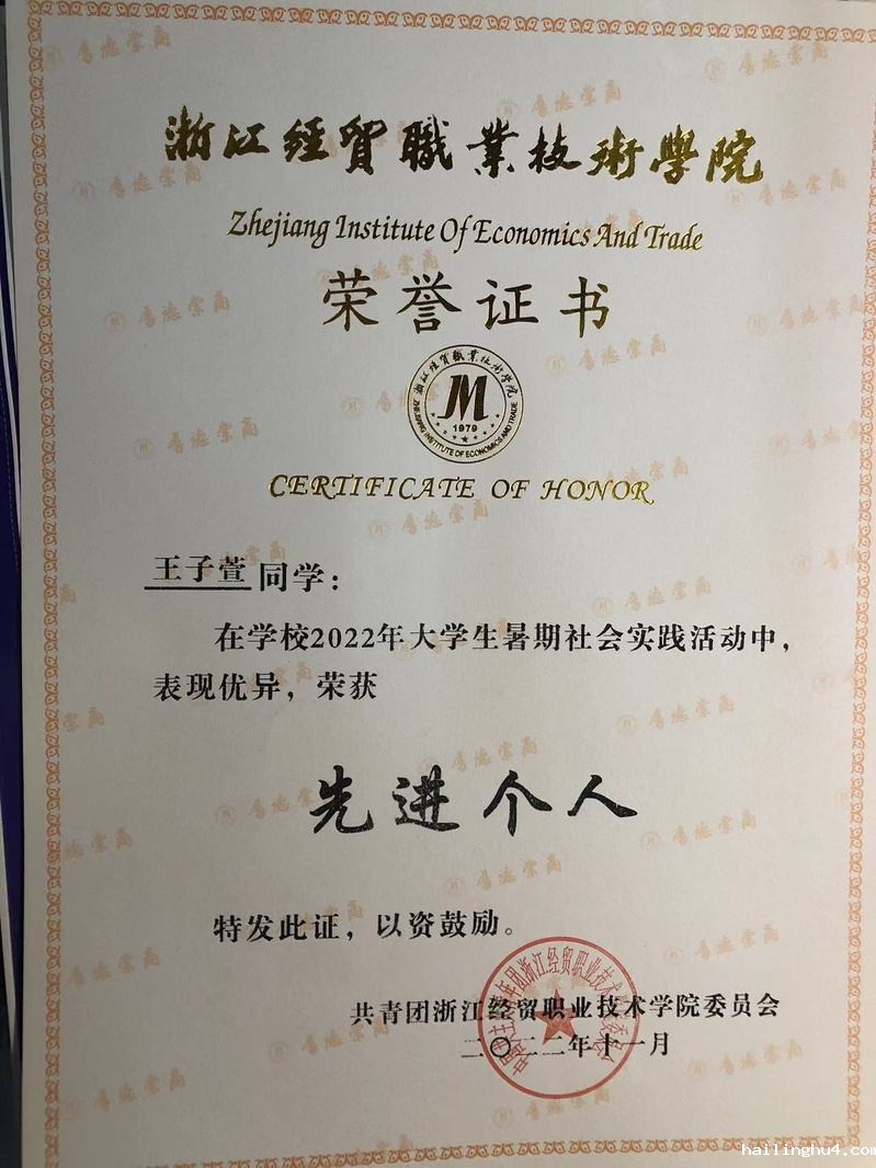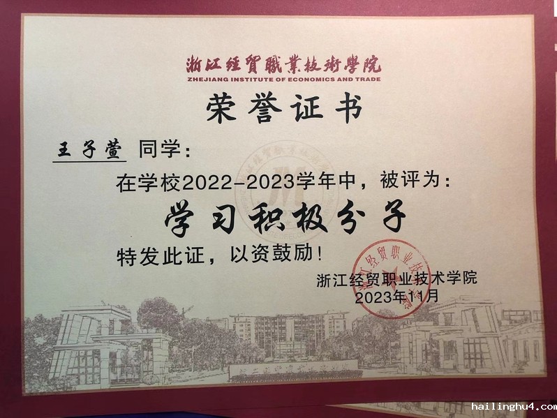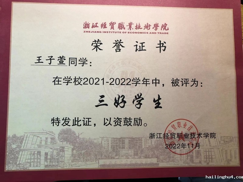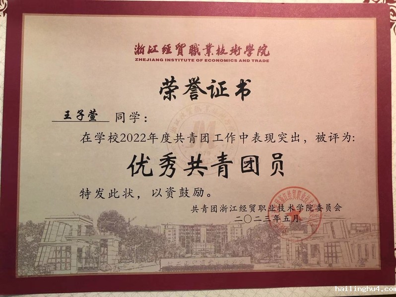 高中毕业于浙江省象山县第二中学。中共预备党员,荣获2022年中国大学生在线“大我青春”暑期社会实践优秀作品、2021-2022学年省政府奖学金、校三好学生、校二等奖学金、校大学生暑期社会实践先进个人、校暑期社会实践优秀团队;2022-2023学年省政府奖学金、校三等奖学金、优秀共青团员。