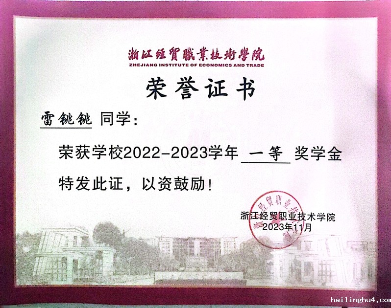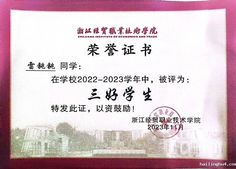 高中毕业于文成中学,中共预备党员,荣获2021-2022学年国家励志奖学金、校一等奖学金;2022-2023学年国家奖学金、共青团中央“三下乡”“返家乡”全国百优社会实践调研报告、浙江省第十二届会展策划创意大赛二等奖、浙江省第十一届大学生广告创意设计竞赛策划案专项赛道三等奖、浙江省“维普·经纶杯”知识香满园主题阅读活动学生组三等奖、浙江省“中文在线杯”全国高职高专院校信息素养大赛三等奖、校一等奖学金。