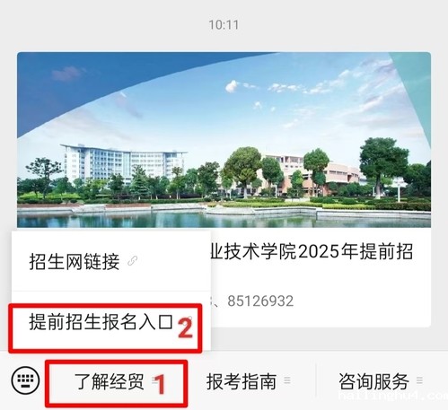 关注微信订阅号浙江经贸职业技术学院招生办(zjjmzs)后点击左下角的“了解经贸”中的“提前招生报名入口”