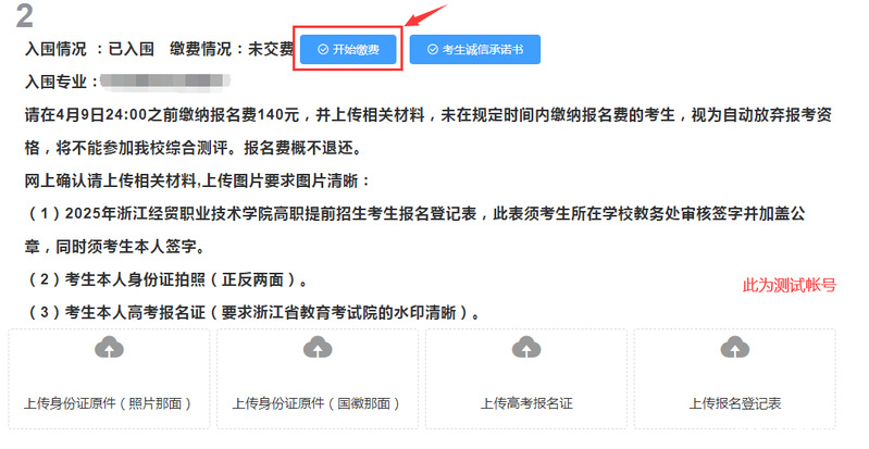 入围综合测评资格的考生进行网上确认和网上缴纳报名费。请在4月9日24:00前登录浙江经贸职业技术学院招生信息网(http://zs.zjiet.edu.cn)进行网上确认和网上缴费。报名费标准为140元/人。若在规定时间内未缴纳报名费的考生视为自动放弃,不得参加综合测评考试。报名费和报名材料概不退还。