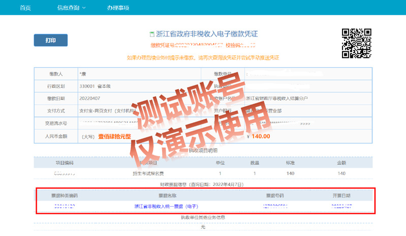 缴费成功后系统平台会自动生成非税收入电子缴款凭证、电子票据,可点击下方的“浙江省非税收入统一票据(电子)”获得电子票据;或者通过手机“浙里办APP”,点击“我的-我的票据”查询电子票据,并自行下载打印“财政电子票据”。