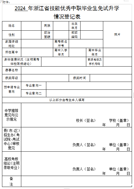 2024 年浙江省技能优秀中职毕业生免试升学情况登记表.doc