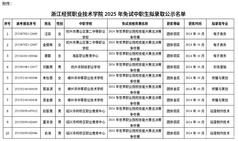 浙江经贸职业技术学院 2025年免试中职生拟录取名单公示