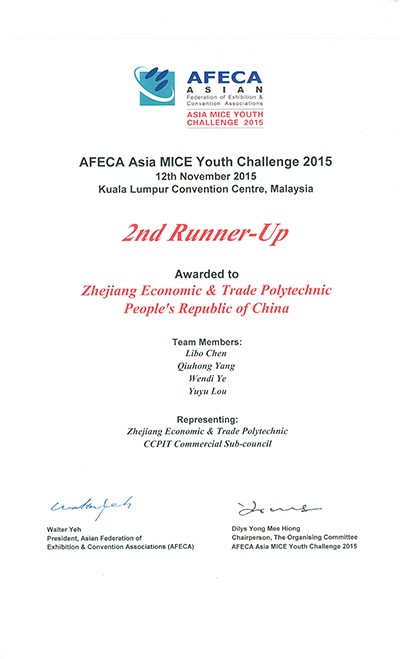 11月12日,由亚洲展览会议协会联盟主办的首届“2015年亚洲会展业青年挑战赛”在马来西亚吉隆坡会议中心落下帷幕。我院会展策划与管理专业杨邱虹、楼雨羽、叶文迪和陈利波四位学生组成的参赛队以作品“首届杭州极简生活展”荣获季军,展现了经贸学子良好的风采。