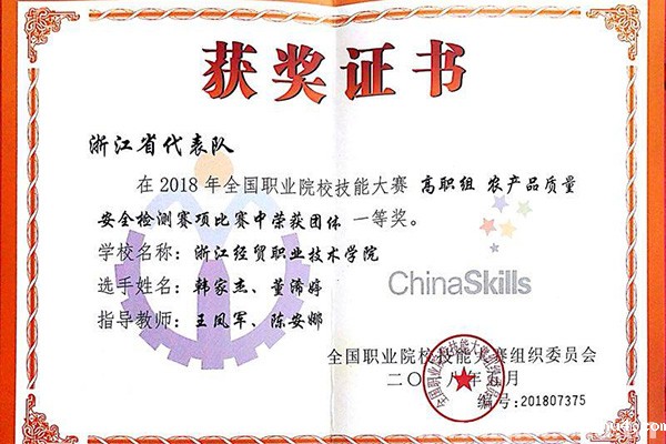 近日,2018年全国职业院校技能大赛(高职组)“农产品质量安全检测”赛项在湖北圆满落幕。代表浙江省参赛的我校应用工程系韩家杰和董浠婷两名同学在比赛中表现优异,荣获团体一等奖。