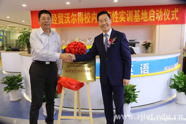 10月25日下午,浙江经贸职业技术学院,上海沃尔得教育科技股份有限公司共建校内生产性实训基地正式启动。校长陈德泉、副校长张红、教务处处长郭伟刚、国际贸易系领导班子以及师生代表出席本次启动仪式。沃尔得教育集团董事长胡洪军与执行总裁史岚女士以及兄弟院校代表应邀出席。