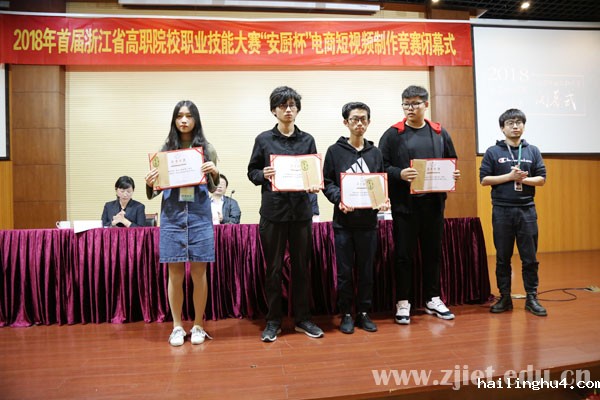 10月21日,由浙江省教育厅主办、我校承办、杭州安厨电子商务有限公司协办的“浙江省2018年首届浙江省高职院校职业技能大赛‘安厨杯’电商短视频制作竞赛”闭幕式暨颁奖典礼在会议中心隆重举行。我校四支代表队荣获一等奖。